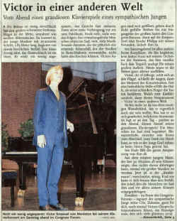 "Victor, der 16jährige, setzt sich an den Flügel, schließt die Augen, dann der Moment der Konzentration. Fast eine bedrohliche Stille erfüllt die Halle, als seine schlanken Finger die Tasten berühren. Welche eine Einfühlsamkeit, dann dieses Temperament - Victor in einer anderen Welt. Die Menschen im Saal sind begeistert. Blumensträuße, einzelne rote Rosen zum Abschied. [...] ersten jungen Mann, der 90 Minuten all sein Können zeigte, den nichts davon abbringen kann, einmal ein großer Musiker zu werden."